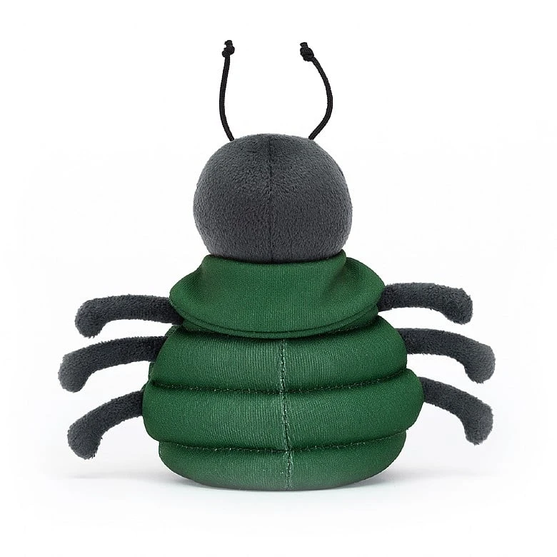 Squat and stylish, Anoraknid Black Spider is bundled up in a leafy green puffa! With bluey-black fur, eight tickly legs, cordy feelers and a friendly grin, this scrambly spider is looking super-snuggly. The perfect outfit for web-weaving, wandering and eating lots of tasty flies!