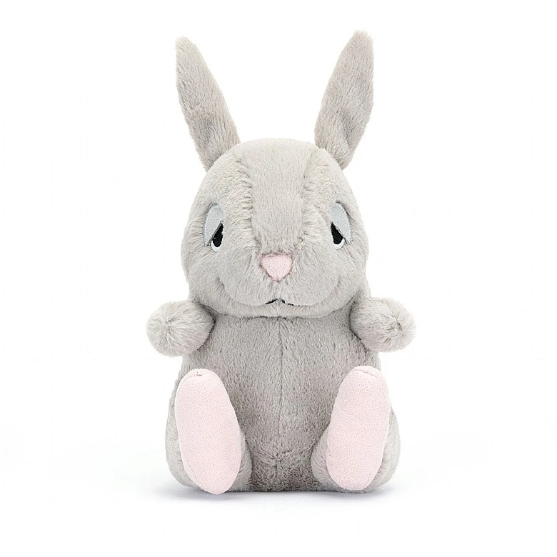 Cuddlebud Bernard Bunny is rumpled, dreamy and just the companion for peaceful dreams. This lazy grey bunny has a flopsy pose, embroidered eyes and suedette lids, with two-tone ears and pink feet with stitch toes.